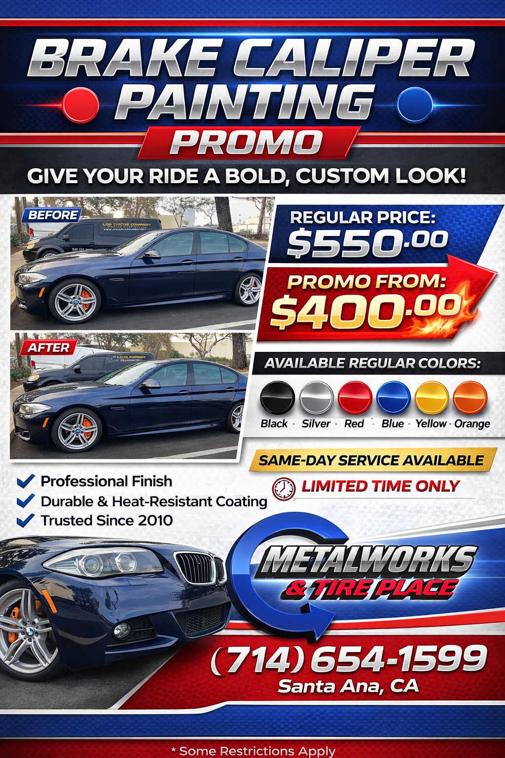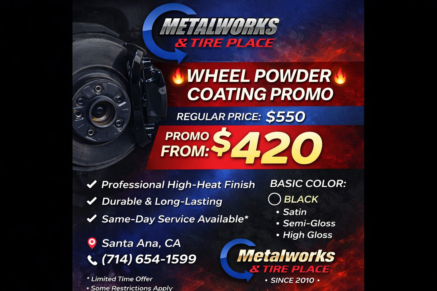 Looking for expert tire and wheel services in Santa Ana, CA? Metalworks & Tire Place has been a trusted destination since 2010, offering a wide range of high-quality tire and wheel solutions with over 20 years of experience. Whether you need new tires, wheel repairs, or custom enhancements, we’re committed to delivering reliable, efficient services that keep your vehicle running smoothly and looking great.